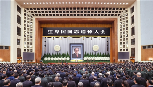 在全场凝重的气氛中,习近平致悼词。习近平在悼词中高度评价了江泽民同志光辉的一生和建立的丰功伟绩。他指出,从党的十三届四中全会到党的十六大的13年中,国际形势风云变幻,我国改革开放和社会主义现代化建设进程波澜壮阔。在国际国内十分复杂的形势下,江泽民同志带领党的中央领导集体,高举马克思列宁主义、毛泽东思想、邓小平理论伟大旗帜,坚持党的基本路线不动摇,紧紧依靠全党全军全国各族人民,坚定不移坚持和发展中国特色社会主义。江泽民同志深刻洞察世界新军事变革的发展趋势,主持制定了新时期军事战略方针,强调要推进中国特色军事变革,坚定不移走中国特色的精兵之路,加强人民军队革命化、现代化、正规化建设。在江泽民同志亲自领导和大力推动下,我国国防和军队现代化建设取得了巨大成就。江泽民同志集中全党智慧创立了“三个代表”重要思想,进一步回答了什么是社会主义、怎样建设社会主义的问题,创造性回答了建设什么样的党、怎样建设党的问题,深化了我们对新的时代条件下推进中国特色社会主义事业、加强党的建设的规律的认识,以新的思想、观点、论断,继承、丰富、发展了马克思列宁主义、毛泽东思想、邓小平理论。