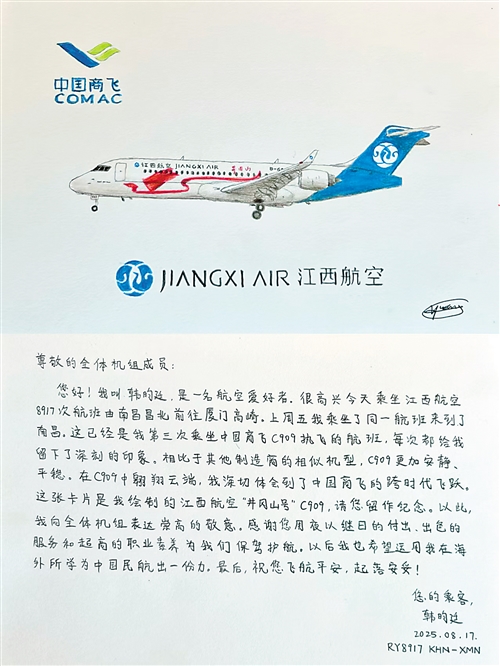 你们好!我是一名航空爱好者。很高兴今天乘坐江西航空8917次航班由南昌昌北前往厦门高崎。上周五,我同样乘坐你们航班来到了南昌。这已经是我第三次乘坐C909执飞的航班,每次都给我留下了深刻的印象。坐着C909翱翔云端,我深切感受到跨时代的飞跃。这张卡片是我绘制的江西航空“井冈山号”C909,请你们留作纪念。在此,感谢全体机组用夜以继日的付出、出色的服务和超高的职业素养为我们保驾护航。以后我希望运用自己在海外所学的知识为中国民航出力。最后,祝你们飞行平安!