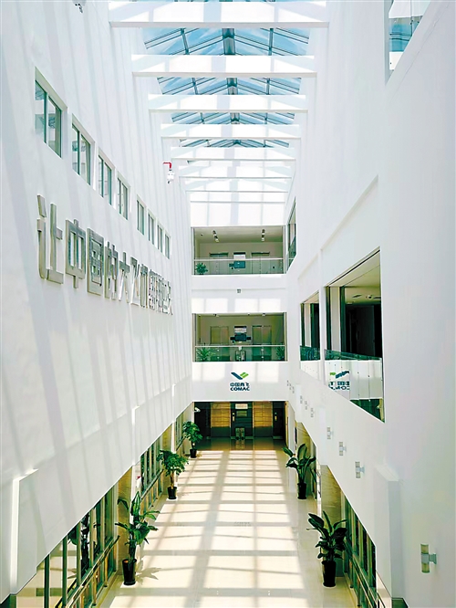 客服公司培训大楼中庭,阳光映照“让中国的大飞机翱翔蓝天”,光影所至,皆是奋进之力。