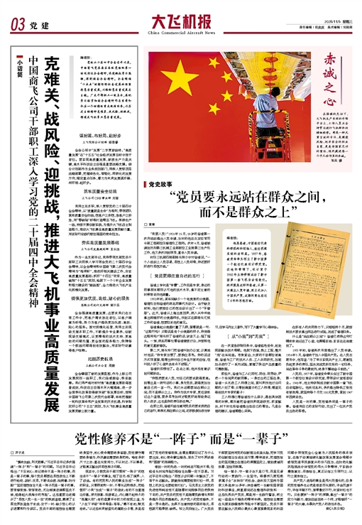 党的二十届四中全会召开以来,中国商飞党委要求各级党组织第一时间传达全会精神,迅速掀起学习热潮,深刻领会全会精神。全会明确“十五五”时期经济社会发展必须坚持高质量发展,以推动高质量发展为主题。广大干部职工一致表示,要把学习好贯彻好全会精神作为当前和今后一个时期的重大政治任务,以历史主动精神克难关、战风险、迎挑战,推进大飞机事业高质量发展。