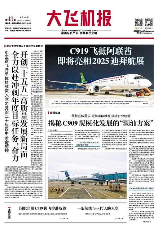 本报讯 11月10日,中国商飞公司1架C919飞机经停孟加拉国达卡哈兹拉特·沙贾拉尔国际机场,飞抵阿联酋迪拜阿勒马克图姆国际机场,准备参加于11月17日至21日举行的2025迪拜航展,这是C919飞机首次在中东地区进行展示。航展期间,将有2架C919飞机和1架C909公务机“组团”亮相。张斌 摄