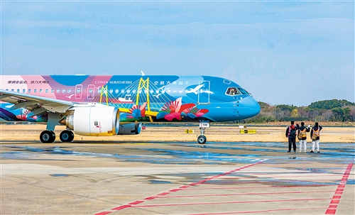 本报讯 1月12日,南航C919“大美湾区号”彩绘机执飞广州至南京航班,至此该型号飞机投入该航线运营。