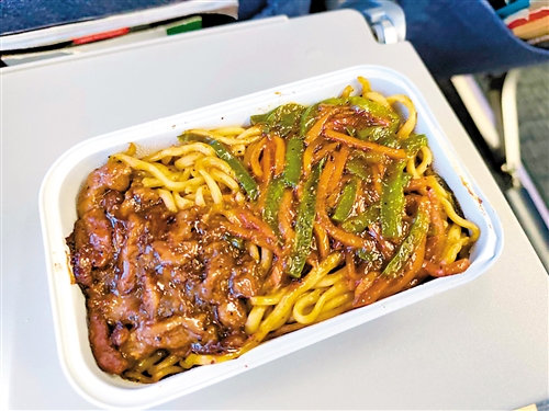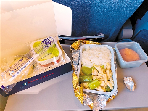 起飞前,矿泉水已经放在了每个人的座椅口袋。很早之前就查到该航班提供正餐,心想还是第一次在C909吃到正餐,还是很激动。起飞后,空乘先端过来我选的特殊餐——低脂餐,芹菜鸡肉米饭搭配蔬菜水果四无软包。味道很不错。当天正常餐是鱼肉饭和牛肉面。